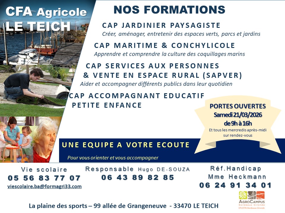 => Nos journées portes ouvertes 2026 auront lieu selon les sites le 24 janvier de 9h à 12h, le 21 mars de 9h à 16h30 et le 6 mai de 14h à 17h.
